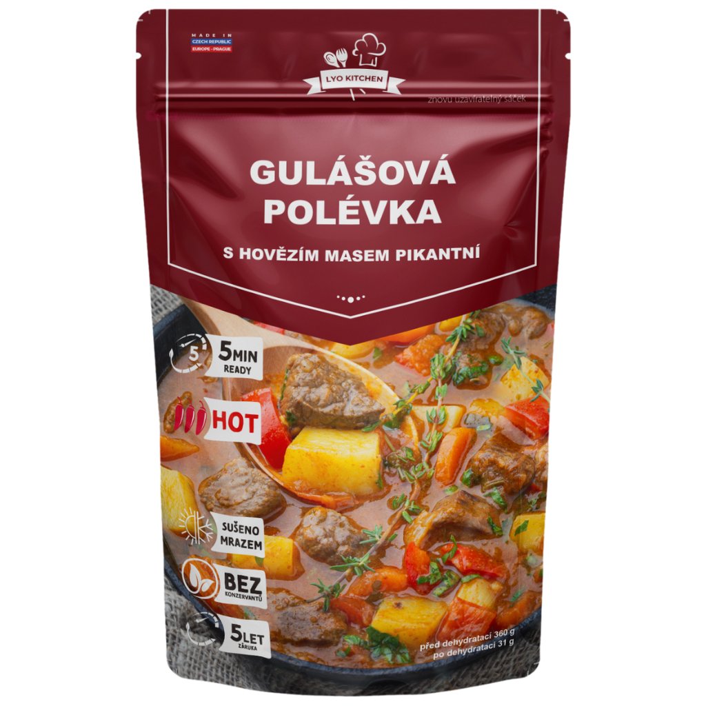 Gulášová polévka s hovězím masem (lyofilizovaná)– plná chuť domácí polévky, kterou si můžete vychutnat kdykoliv a kdekoliv. Díky šetrnému mrazem sušení si zachovává své nutriční hodnoty i bohatou chuť – bez konzervantů a chemie, přesně tak, jak ji máme rádi.