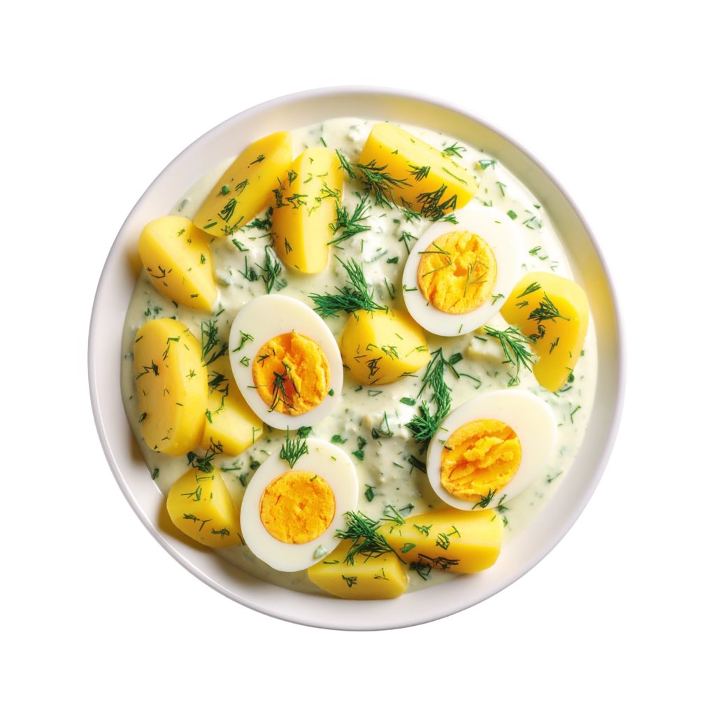 | Složení: | Brambory 51,5 %, vejce 20,6 % (vařená loupaná slepičí vejce v nálevu, jedlá sůl 0,53 %, regulátory kyselosti: kyselina citronová, kyselina octová, kyselina mléčná), smetana 10,3 %, mléko 8,8 %, kopr 2,9 %, máslo 1,5 % (smetana), pšeničná mouka 2,2 %, jedlá sůl, cukr, pepř černý, česnek, dextróza, antioxidant: kyselina L-askorbová, extrakt koření, ocet (ocet kvasný lihový, barvivo: E150c). Výživové údaje hotového pokrmu na 100 g: Energetická hodnota 289 kJ / 69 kcal. Tuky 4,2 g, z toho nasycené mastné kyseliny 2,5 g. Sacharidy 5,4 g, z toho cukry 1,4 g. Bílkoviny 3,8 g. Sůl 0,5 g. |