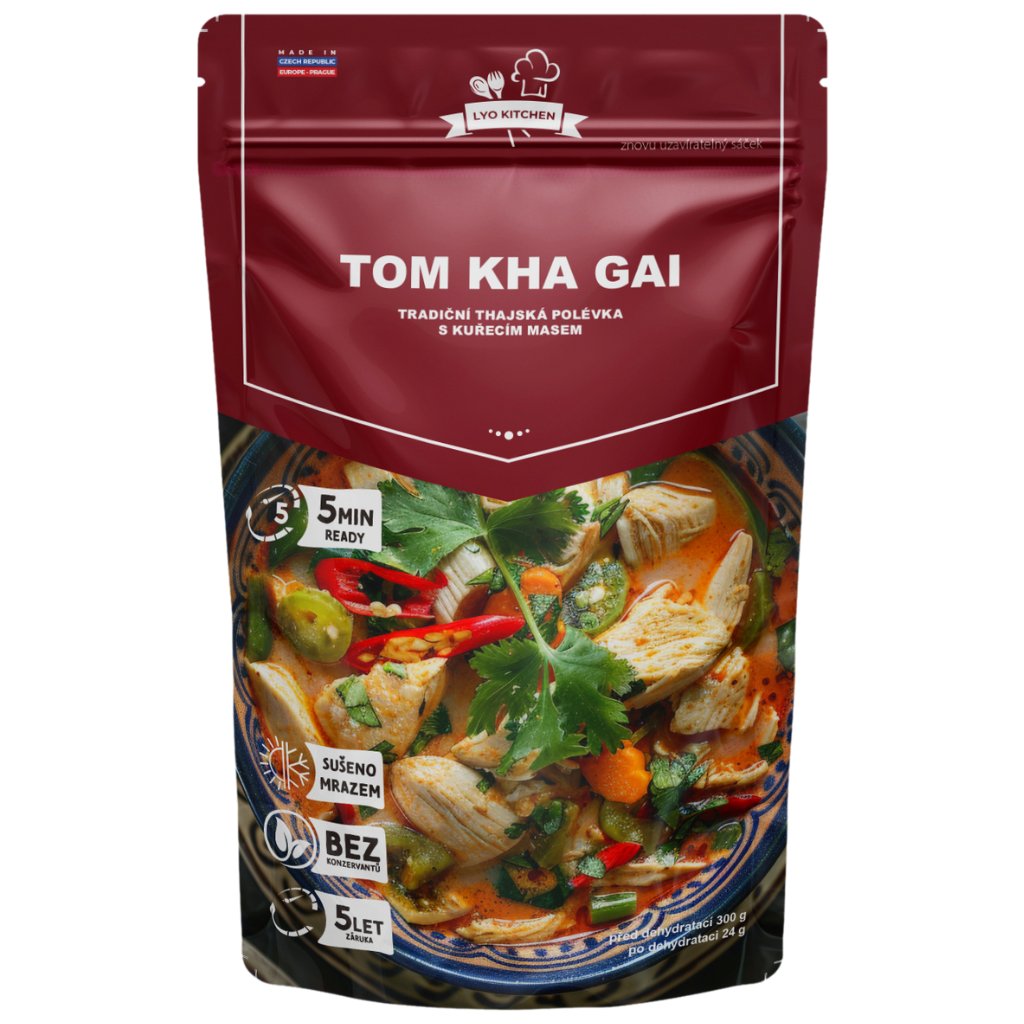 Thajská kokosová polévka s kuřecím masem (lyofilizovaná) – polévka, kterou si můžete vychutnat kdykoliv a kdekoliv. Díky šetrnému sušení mrazem si zachovává své nutriční hodnoty i bohatou chuť – bez konzervantů a chemie, přesně tak, jak ji máme rádi.