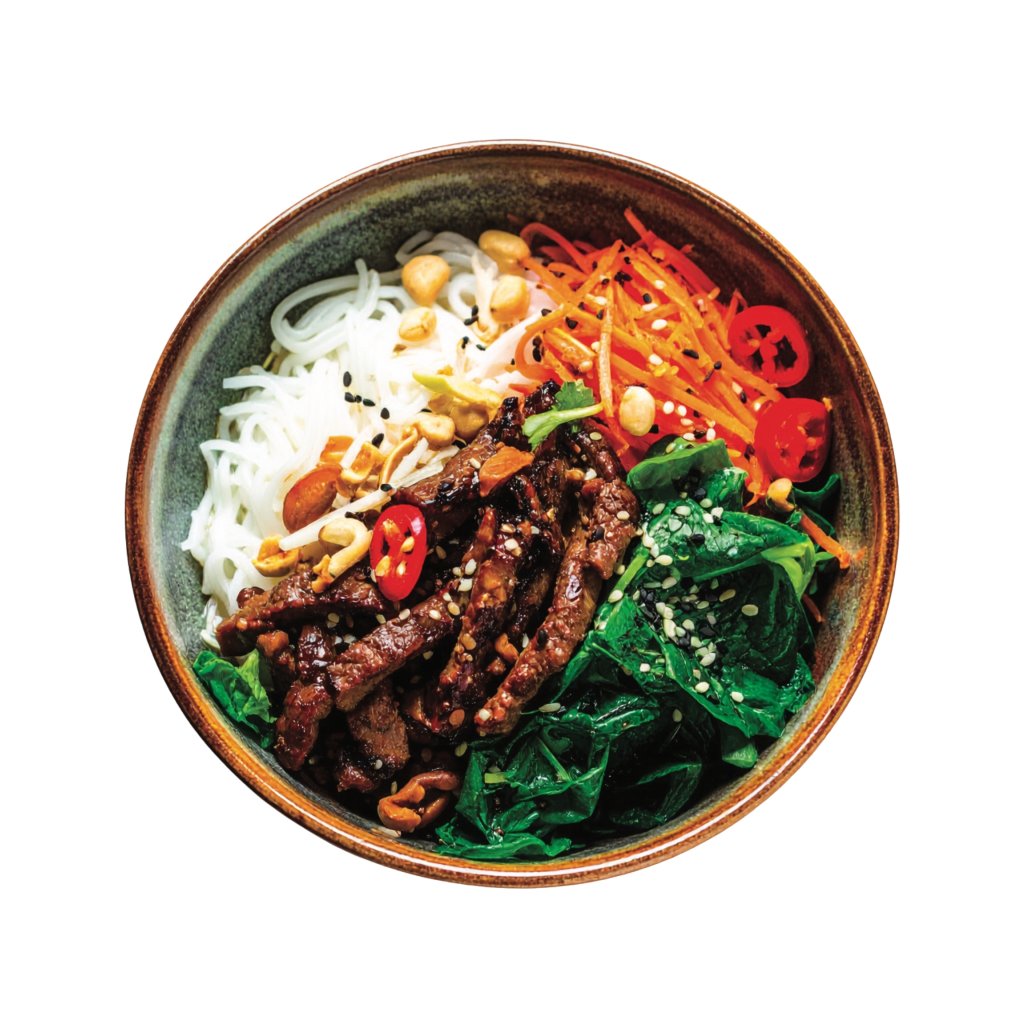 Lyolizované Bún bò Nam Bộ (s hovězím masem) - vietnamské jídlo s kousky hovězího masa, rýžovými nudlemi, bylinkami a lahodným dressingem.